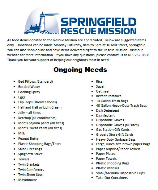 Where to bring donations: Springfield Rescue Mission, 10 Mill Street, Springfield, MA. Monday – Saturday, 8am-6pm.